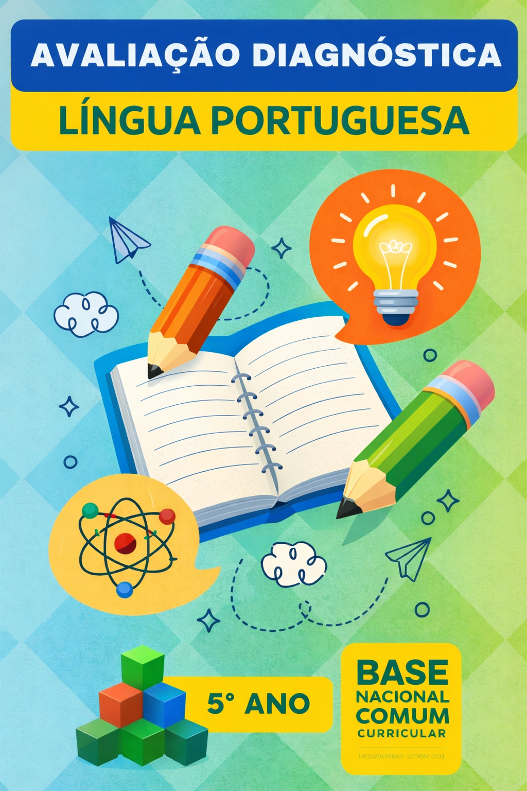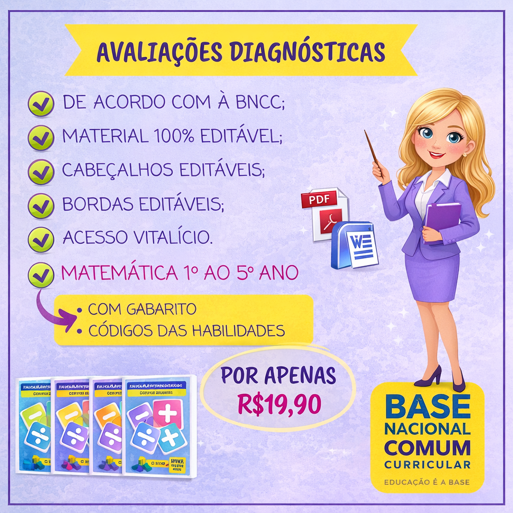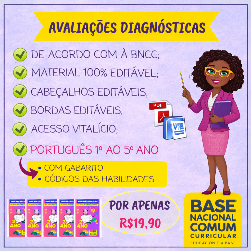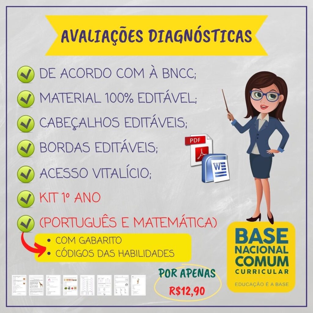 São mais de 120 páginas com avaliações diagnósticas do 1º ao 5º ano alinhadas à BNCC e com GABARITO.